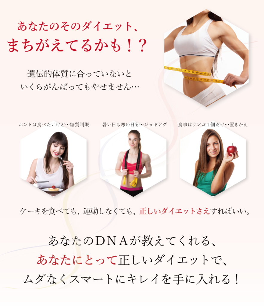遺伝子検査では、糖質・脂質・たんぱく質というダイエットには欠かせない栄養素の代謝リスクを調べることが出来ます。「炭水化物を抜いてるけど痩せない」「食事の量減らしているのだけど、全然痩せない」「運動をしているけど体に変化がない…」など、効率の悪いダイエットリスクを減らすことが出来ます。ダイエットの近道は自分の身体の状態(遺伝子)を把握し最適な栄養素、自分の体質、どういった運動が向いているのか?など細かく分析する事です。